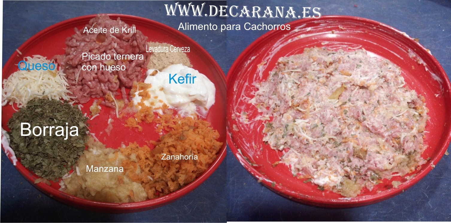 Menús: Adulto 3% de su peso. Cachorro 5% de su peso ( si precisa más subir porcentaje ). 50% Carne con Hueso. 20% pescado o carne, 5% hígado, sesos 5% asaduras. 10% Frutas, Zanahoria,10% verduras, Hortalizas bien picadas y cocinada.