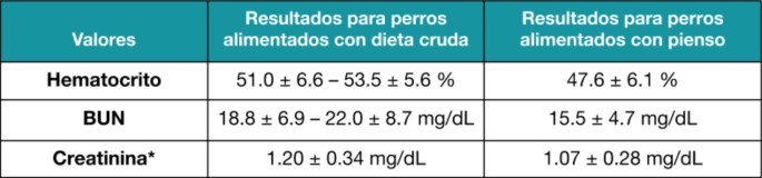 Ahora, veamos los valores obtenidos tanto en perros alimentados con dieta cruda como en perros alimentados con pienso.